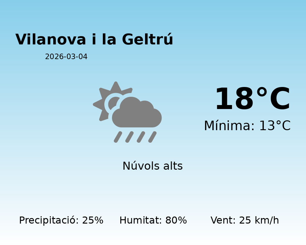 El cel estarà majoritàriament cobert durant la jornada i es preveuen precipitacions que poden acumular fins a 25 mm. Aquestes pluges podrien ser especialment intenses durant la tarda, per la qual cosa es recomana dur un paraigua si heu de desplaçar-vos.