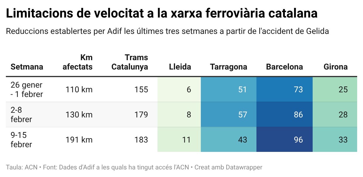 ACN Tarragona – La xarxa ferroviària catalana tindrà restriccions de velocitat en 191 quilòmetres la setmana que ve, 61 quilòmetres més dels que hi ha hagut aquesta setmana, segons el Document Setmanal de Limitacions Temporals de Velocitat elaborat per Adif que entrarà en vigor dilluns vinent i al qual ha tingut accés l’ACN. Els 191 quilòmetres es reparteixen en 183 trams arreu del país, quatre més dels que hi ha aquesta setmana. Tot i això, 72 quilòmetres fan referència a un únic tram, el que uneix Riba-roja d’Ebre i Reus i on els maquinistes poden circular com a màxim a 30 km/h a causa de l’estat de la via i de les obres que hi fa Adif. En aquest recorregut, que pertany a l’R15, ja fa dies que Renfe ha fixat el transport de viatgers per carretera.