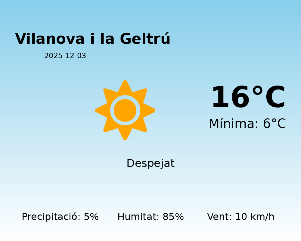 Avui a Vilanova i la Geltrú, esperem una jornada amb una temperatura màxima de 16°C i una temperatura mínima de 6°C. Aquestes temperatures són típiques per l’època de l’any, tot i que podem esperar una sensació una mica més fresca degut a la humitat elevada.