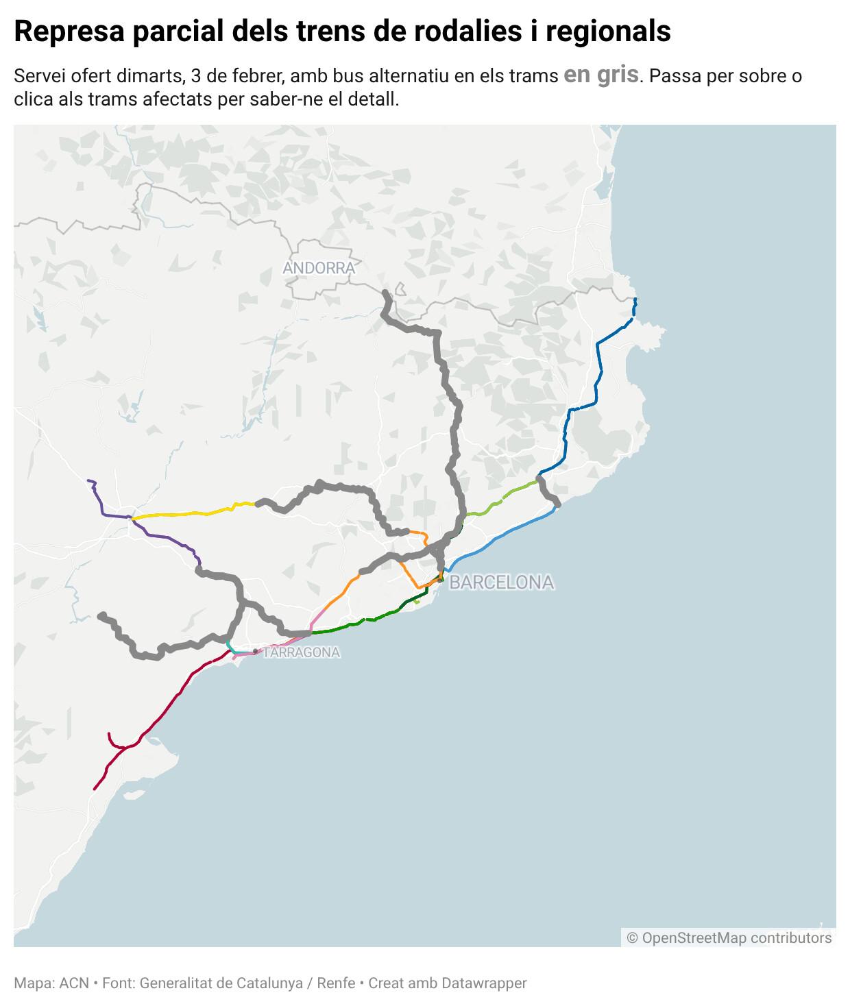 ACN Barcelona – Rodalies començarà el servei dimarts amb les mateixes condicions que avui, segons ha explicat a l’estació de Sants el portaveu de Renfe a Catalunya, Antonio Carmona. Es manté, doncs, el servei per carretera per a onze línies. Aquest dilluns s’ha recuperat en tren el tram de Figueres a Portbou de la línia R11, que demà farà tot el recorregut en tren. El portaveu de Renfe ha reiterat el missatge del matí, “s’està garantint la mobilitat” dels usuaris en transport ferroviari o en bus, mentre es continua treballant per recuperar “progressivament” més trams en tren. Així, l’R1, RG1, R3, R4, RL4, R7, R8, R13, R14, R15 i RT1 mantenen trams en tren i en autobús, mentre que l’R2 nord, l’R2 sud, l’R11, l’R16 i l’R17 presten tot el servei en tren.